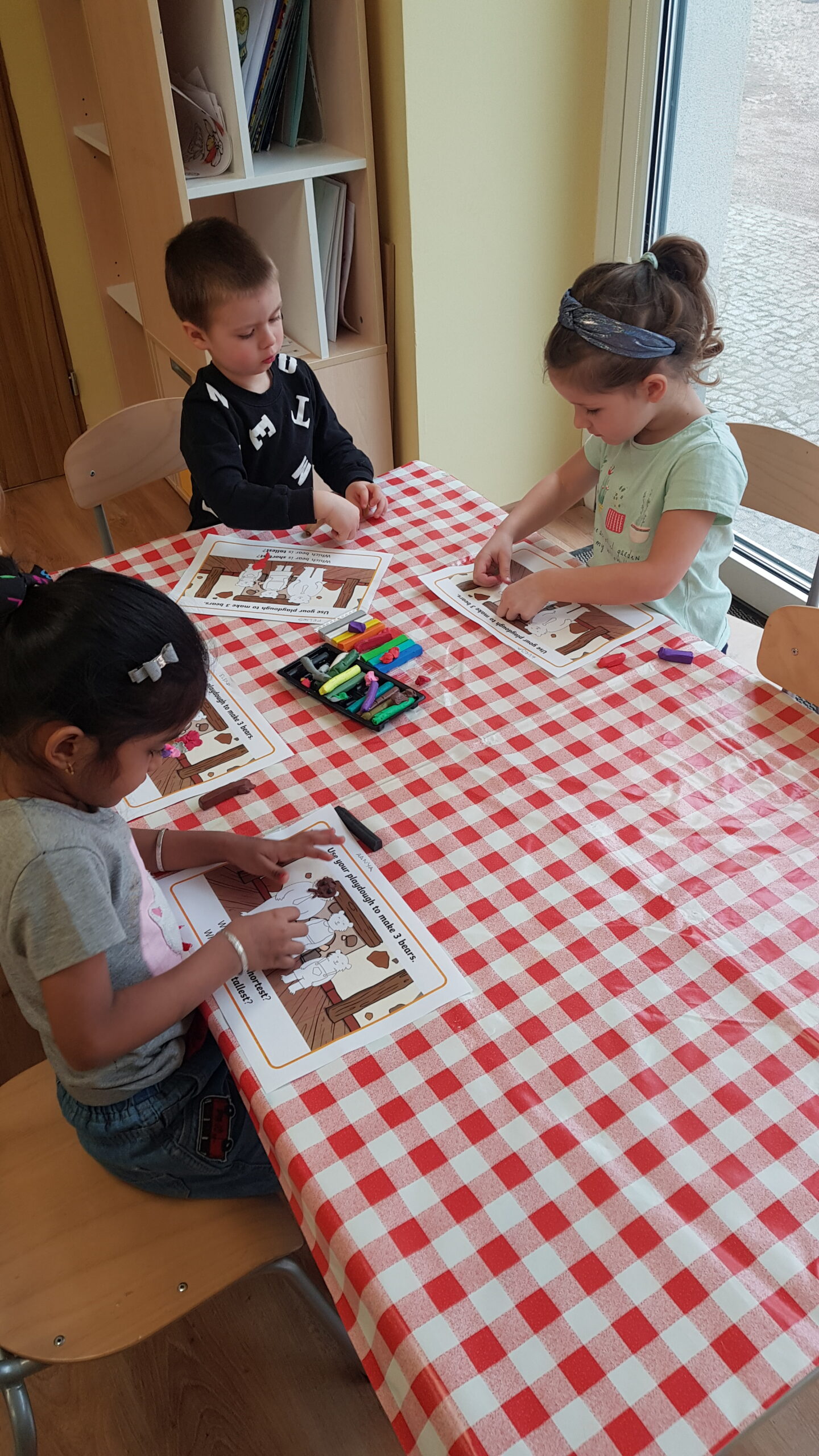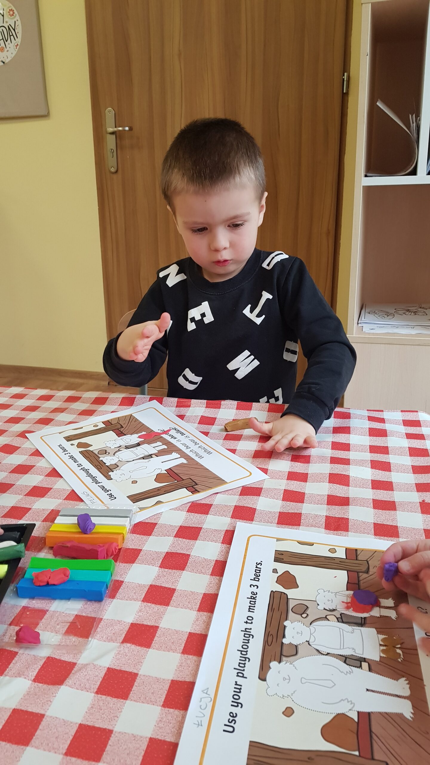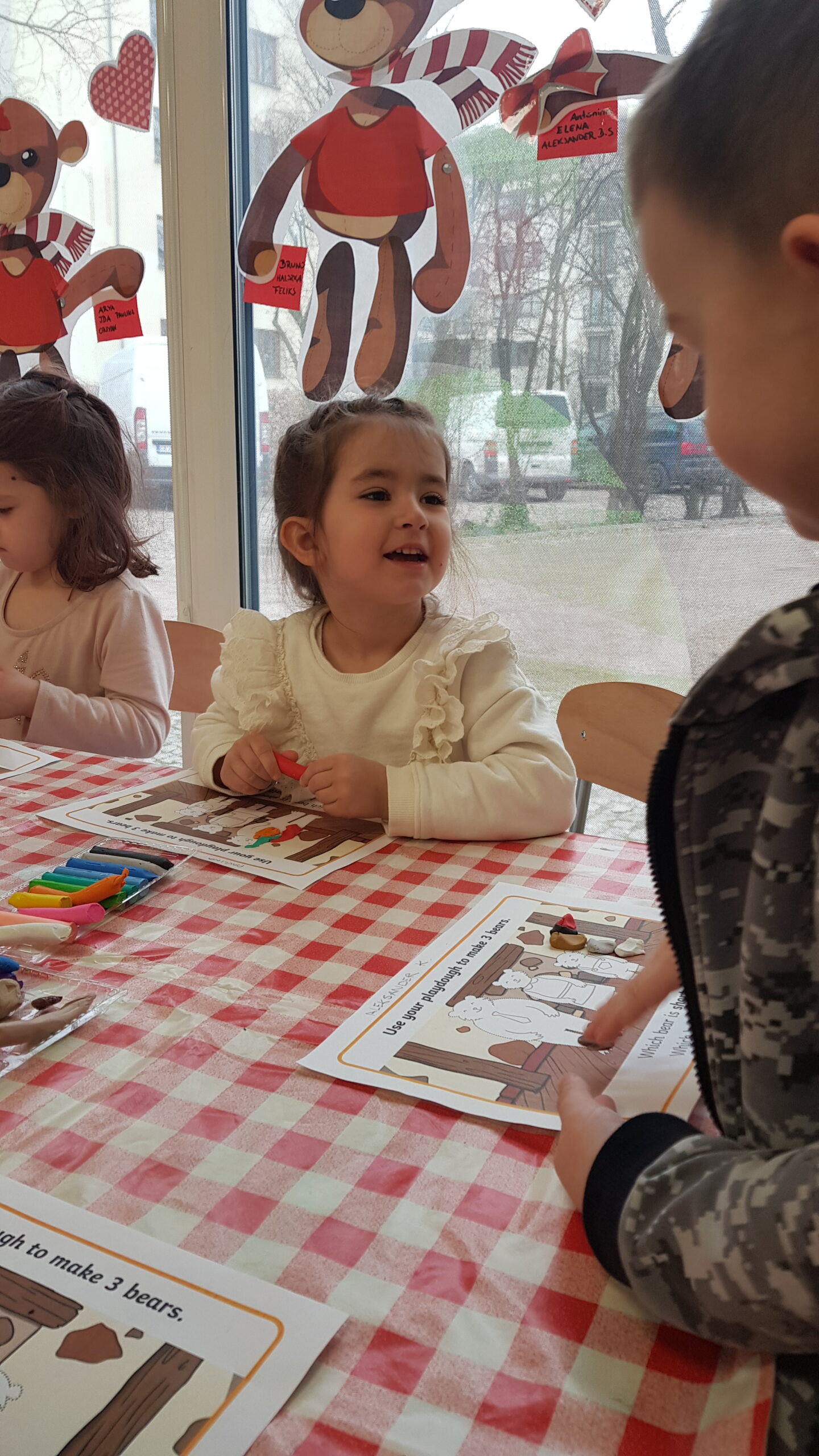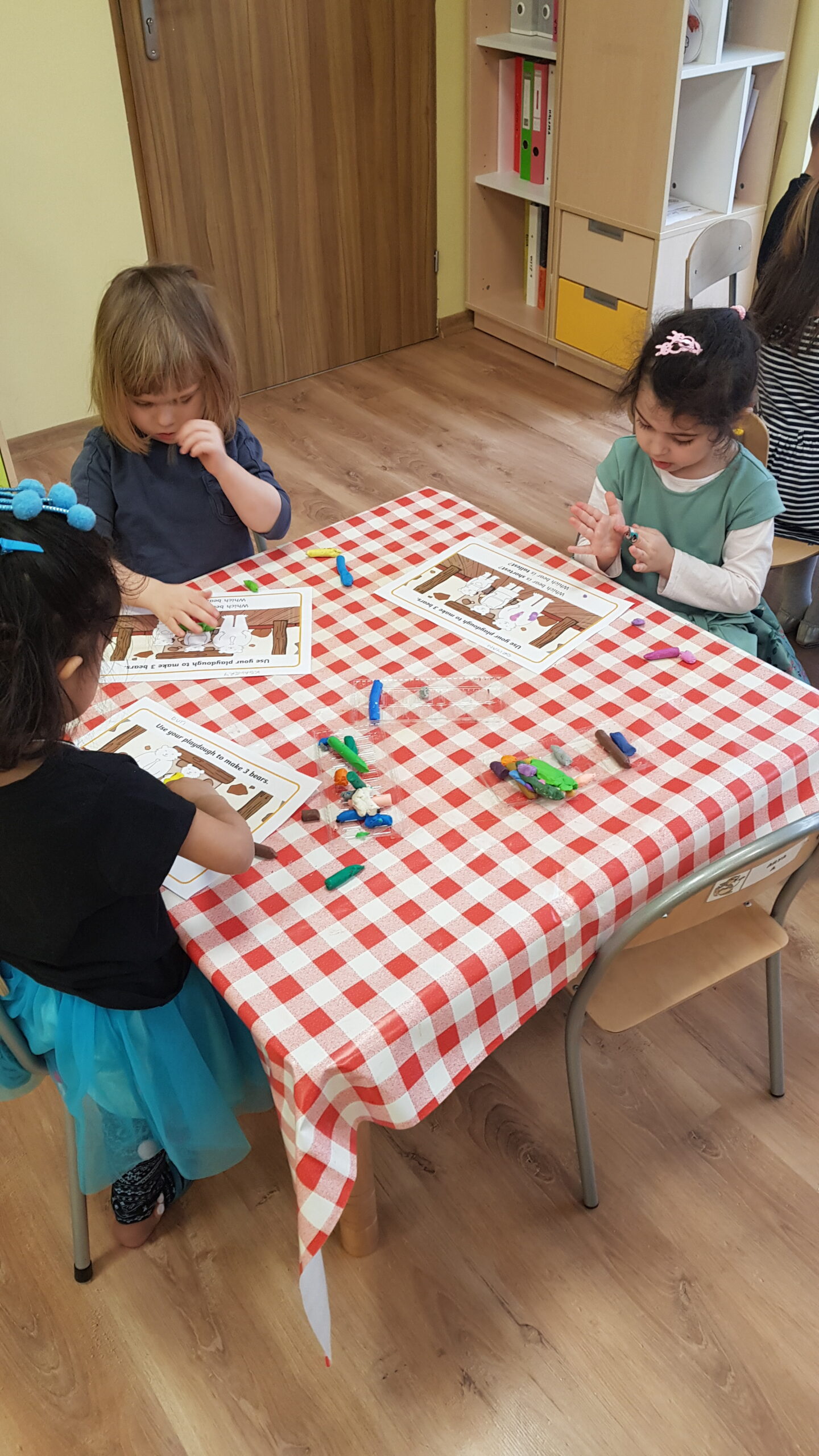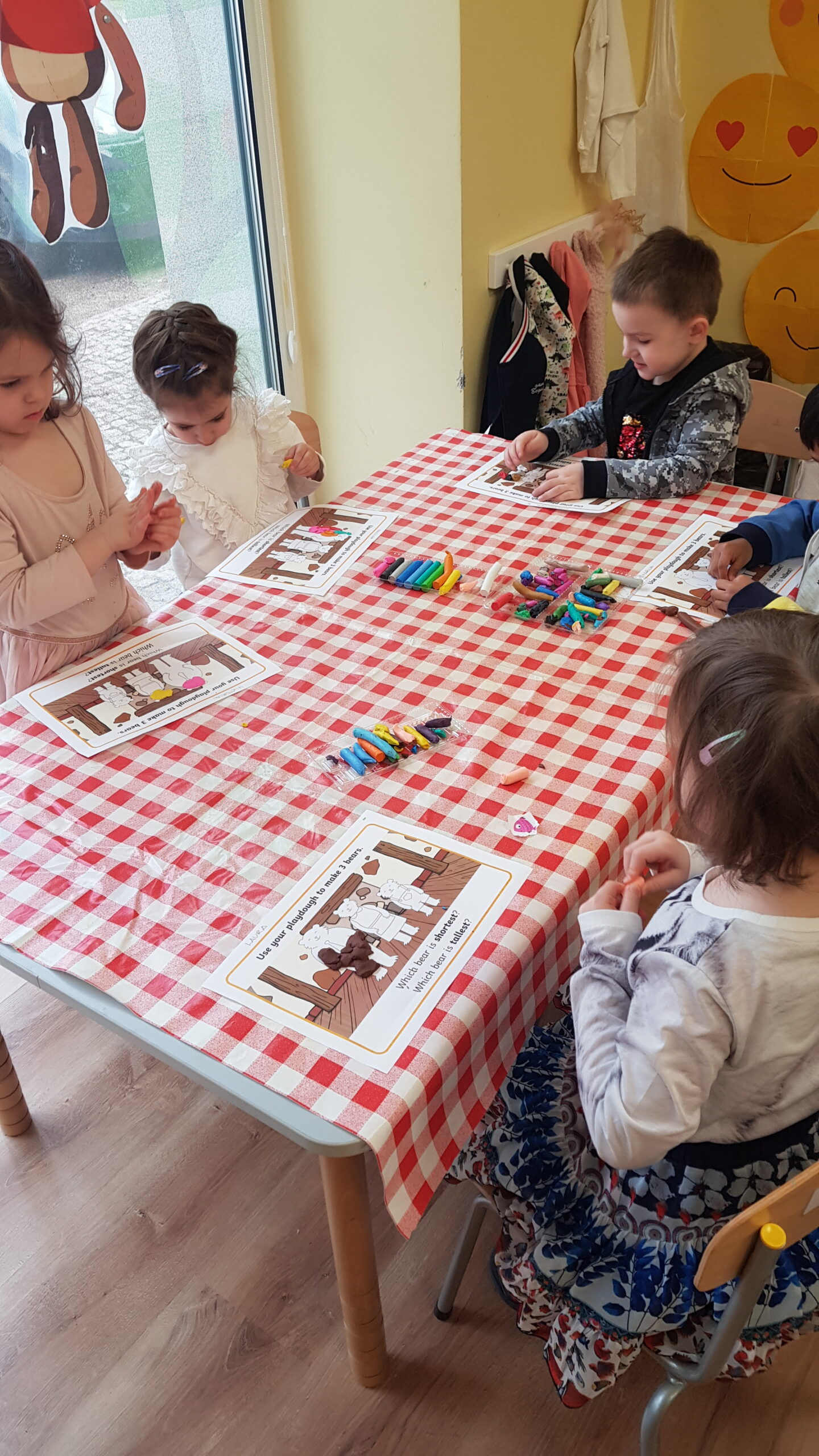 Grupa Bouncy Bunnies przeczytała historię Złotowłosej i trzech misiów, a póżniej pracowała nad motoryką małą wyklejając misie z plasteliny. 👱♀️🧸🧸🧸