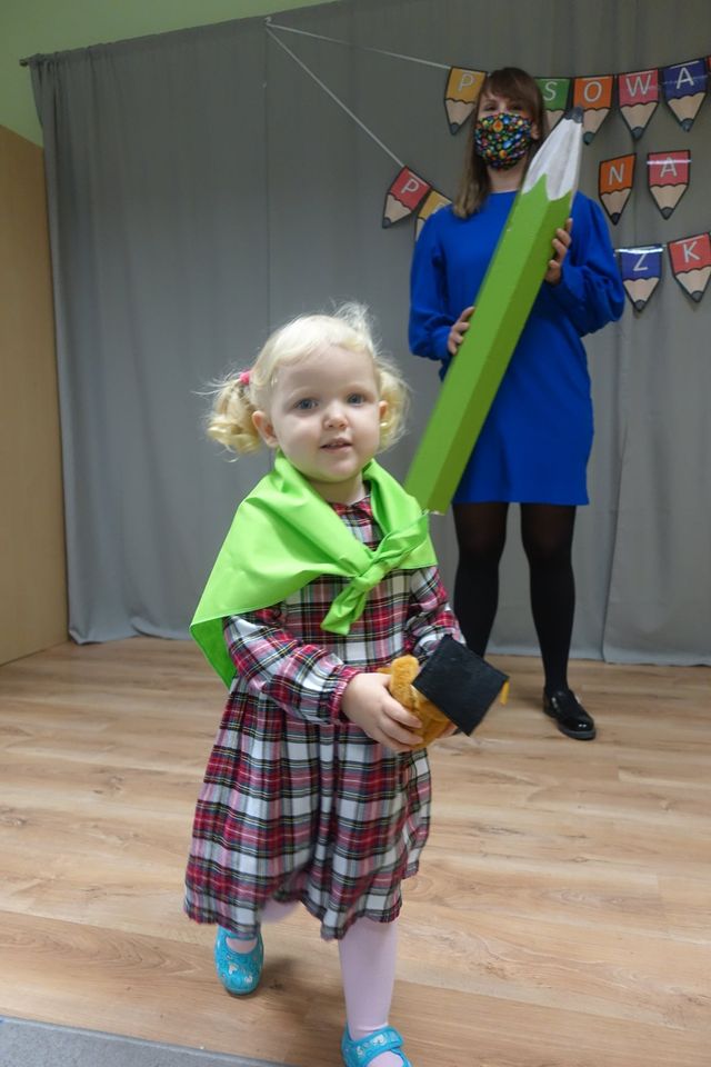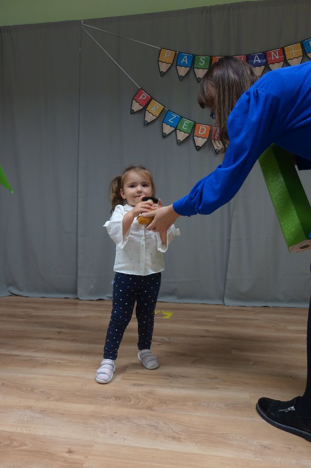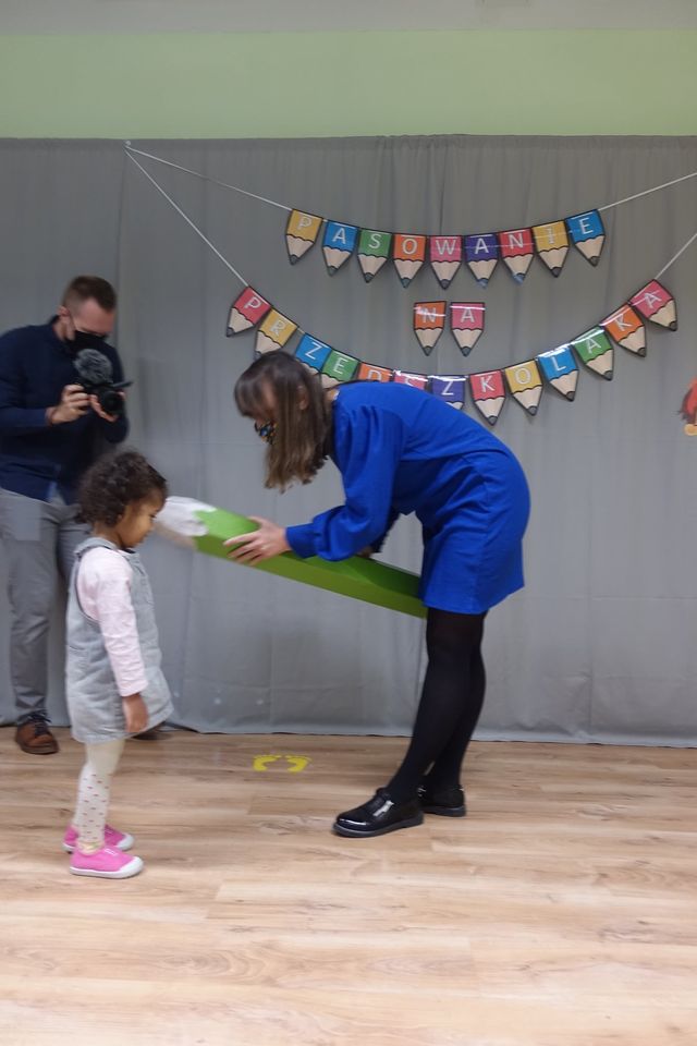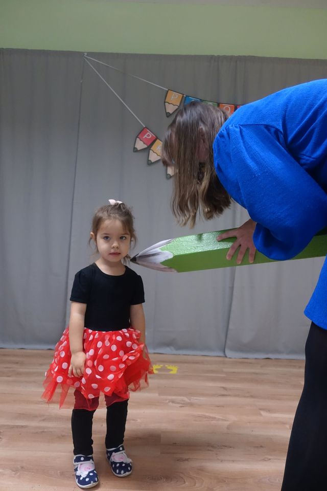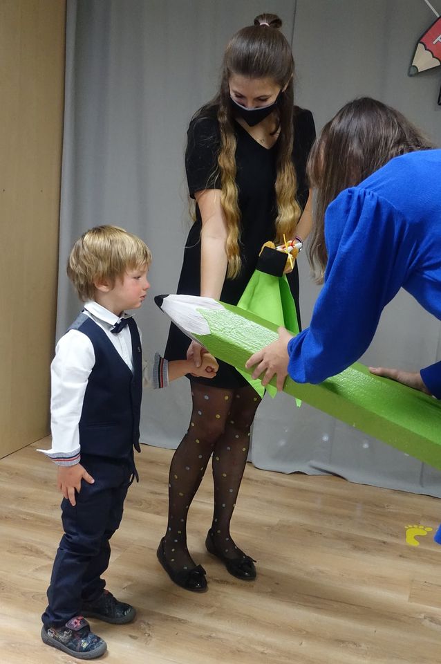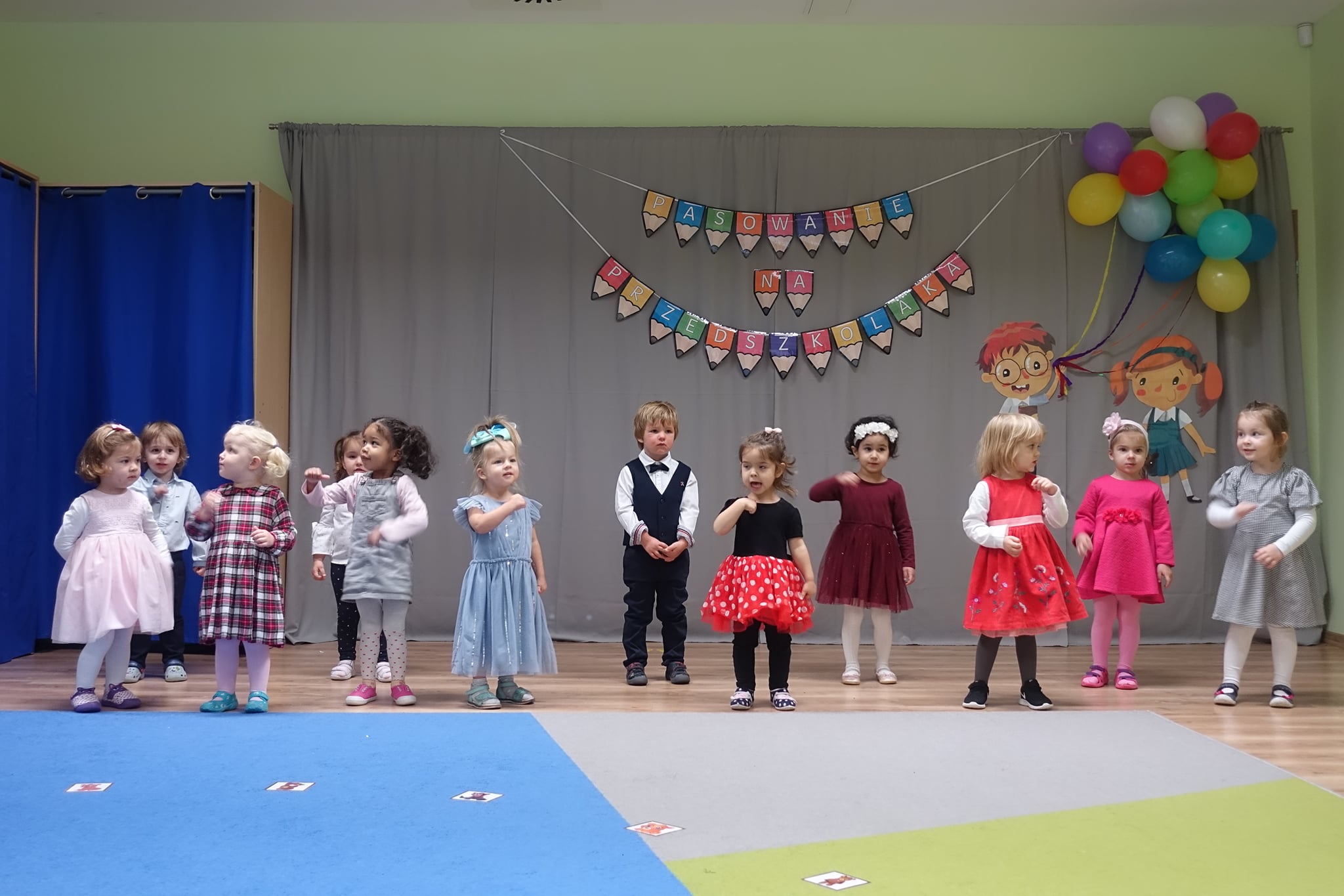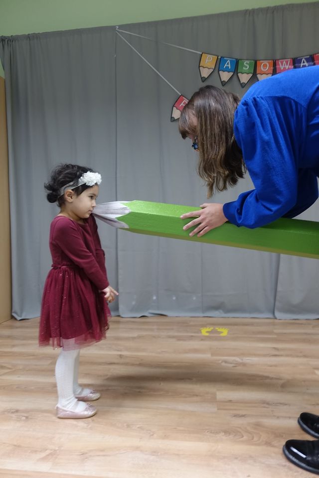 Dla przedszkolaków z grupy Bold Bears było to ogromne przeżycie. Mali artyści zaprezentowali przygotowane piosenki, tańce i wierszyk, a następnie Pani Dyrektor każdego pasowała na przedszkolaka olbrzymią kredką.