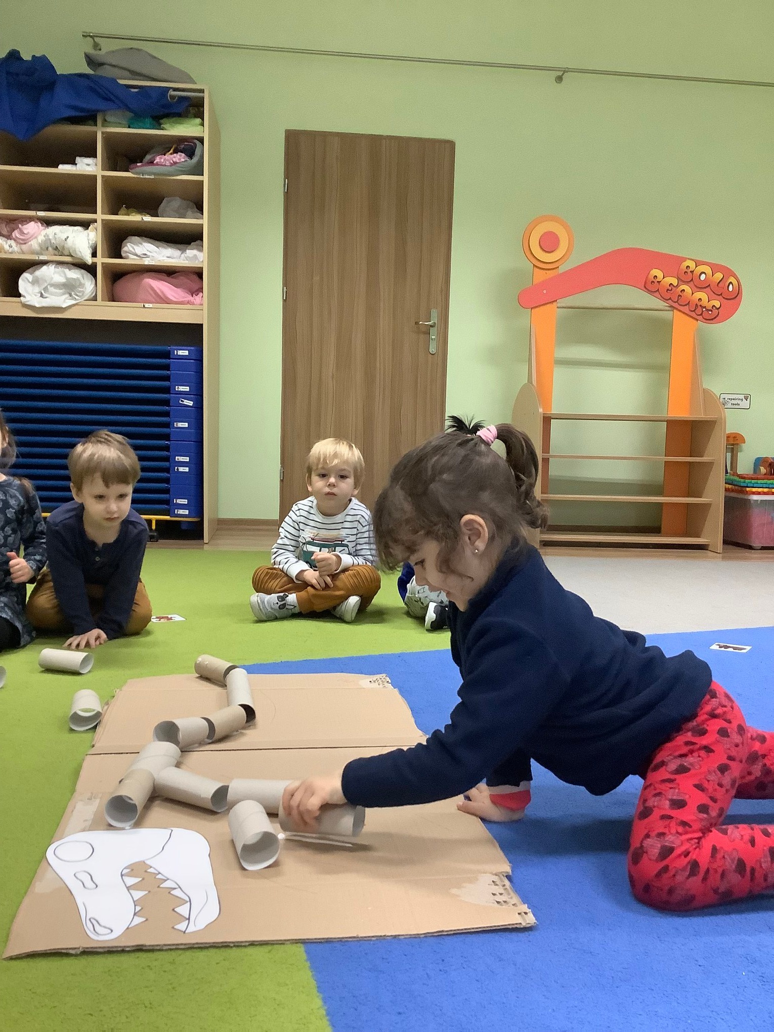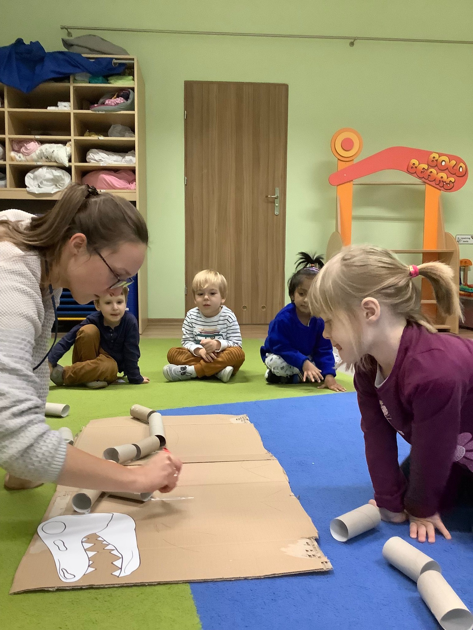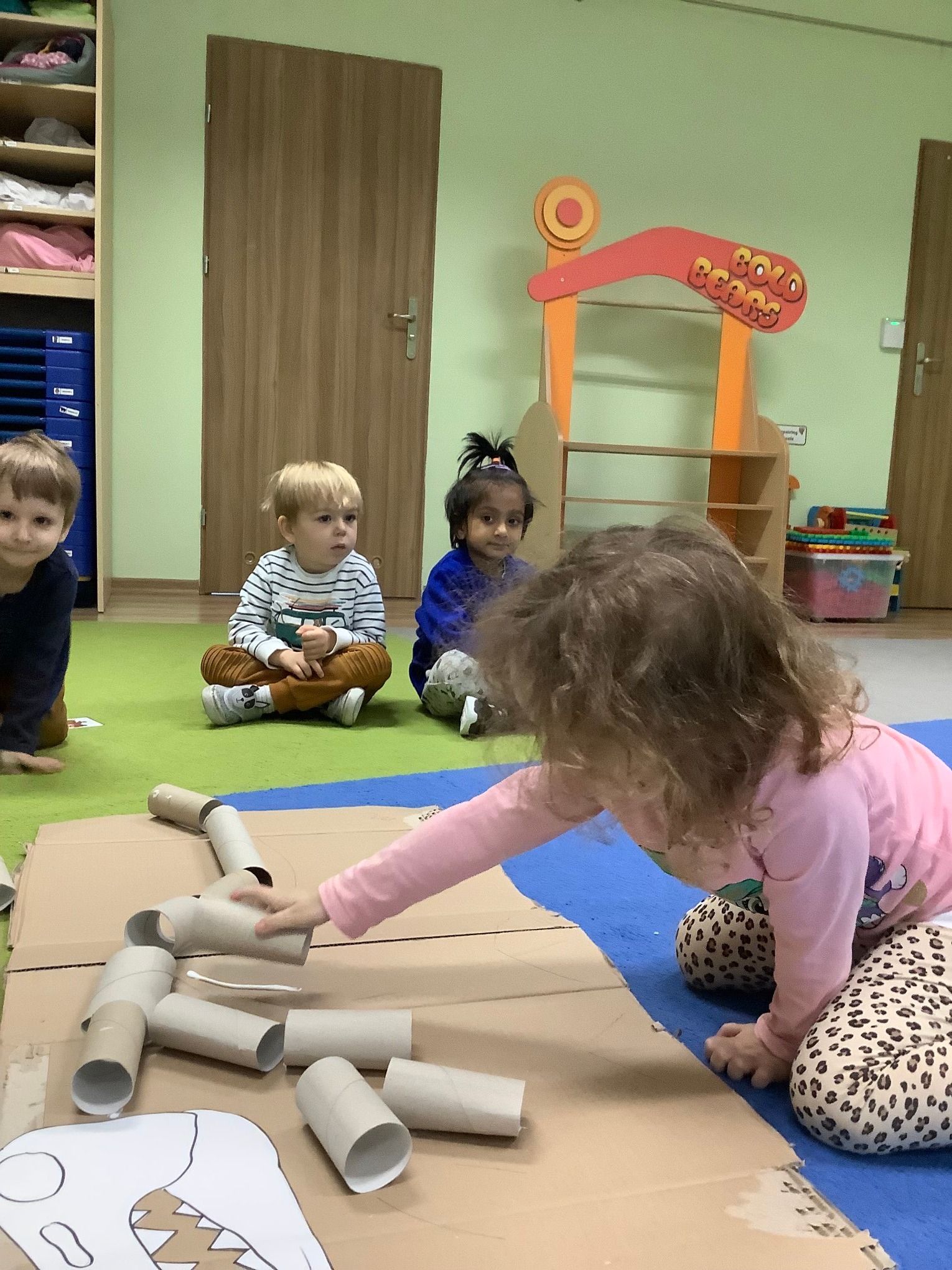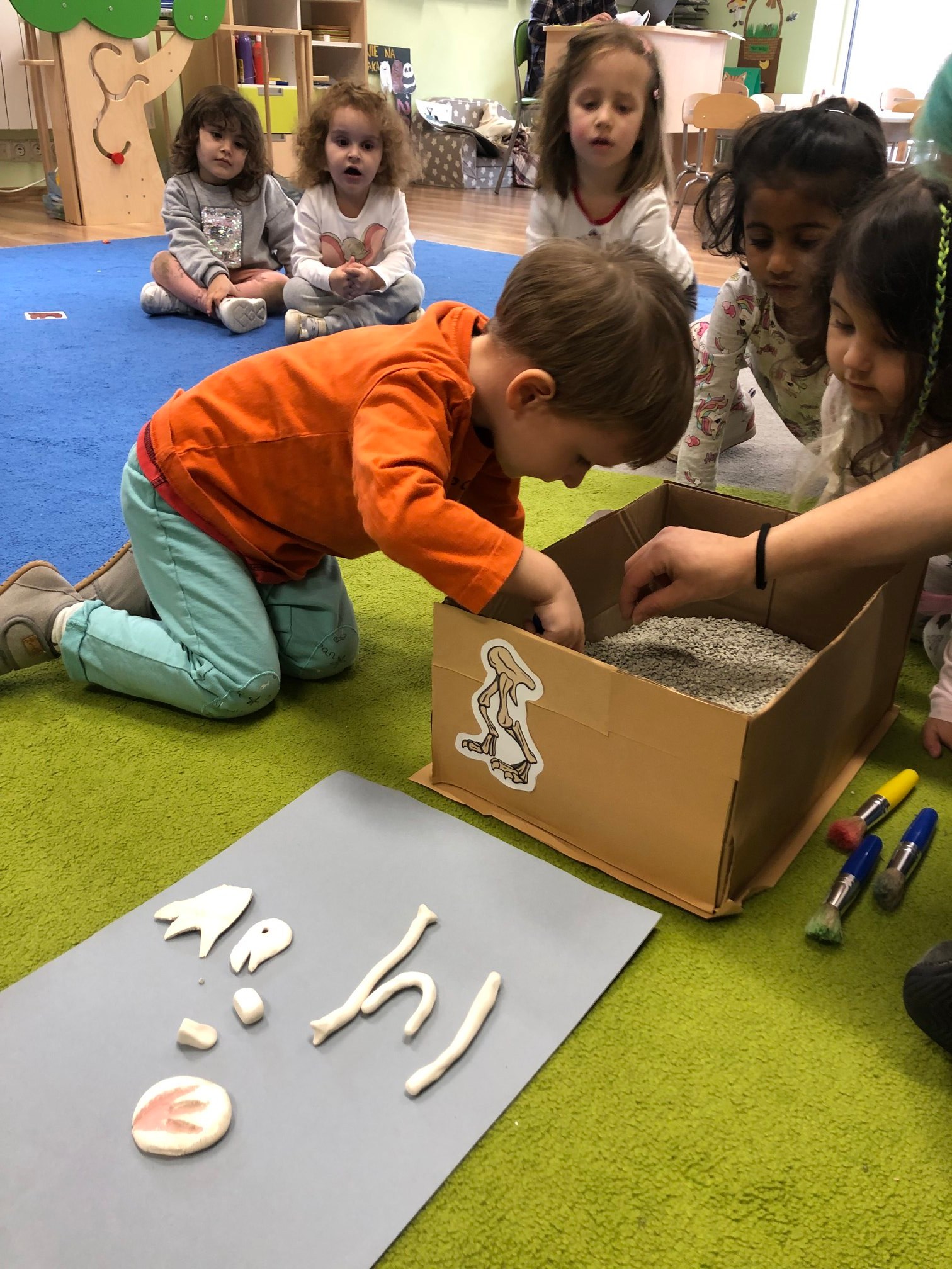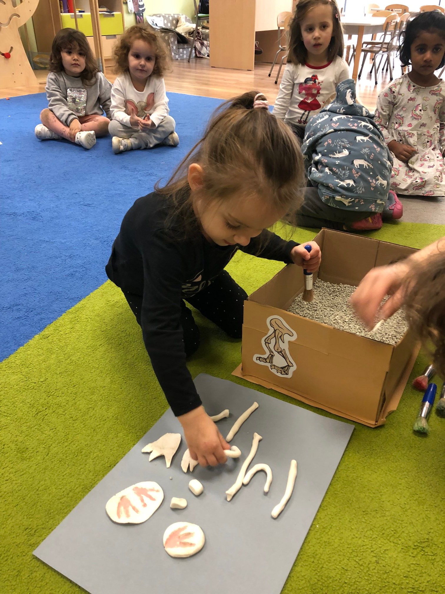 Bold Bears bawili się w Archeologów! Szukali kości i skamieniałości w pudełku z piaskiem, rozmawiali o kolorach dinozaurów, rozmiarach i czym się różniły. Jedne miały długie ogony, a inne krótkie, jedne pływały w wodzie i inne latały w powietrzu. Układali puzzle z dinozaurami, tworzyli dinozaury z papierowych talerzy, a także stworzyliśmy wspólnie dinozaura z tekturowych rolek!