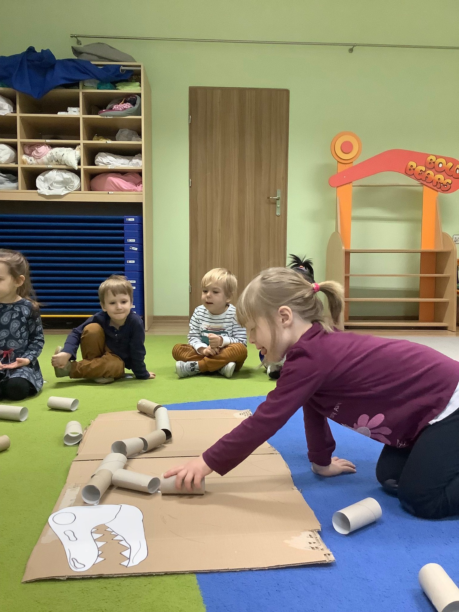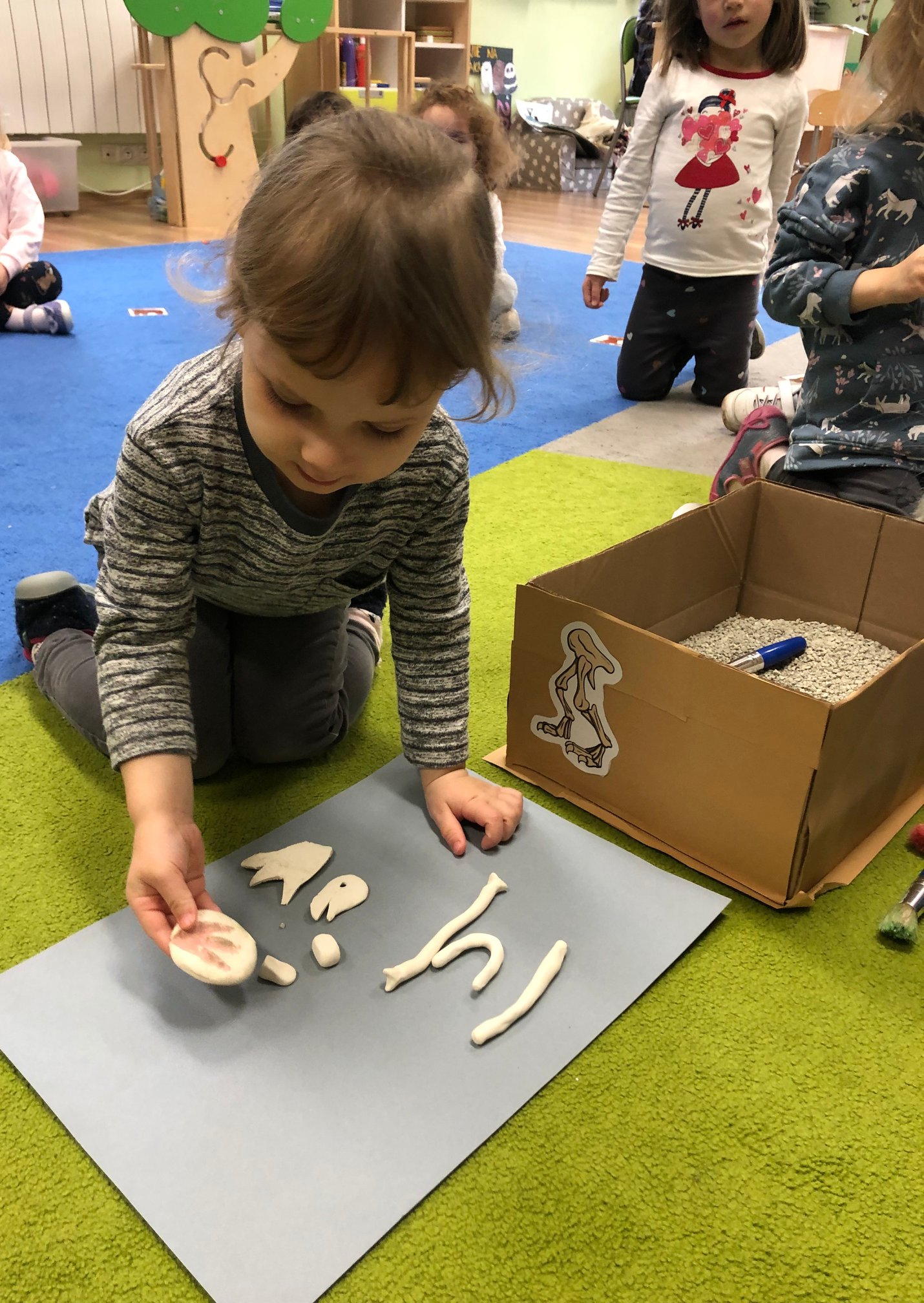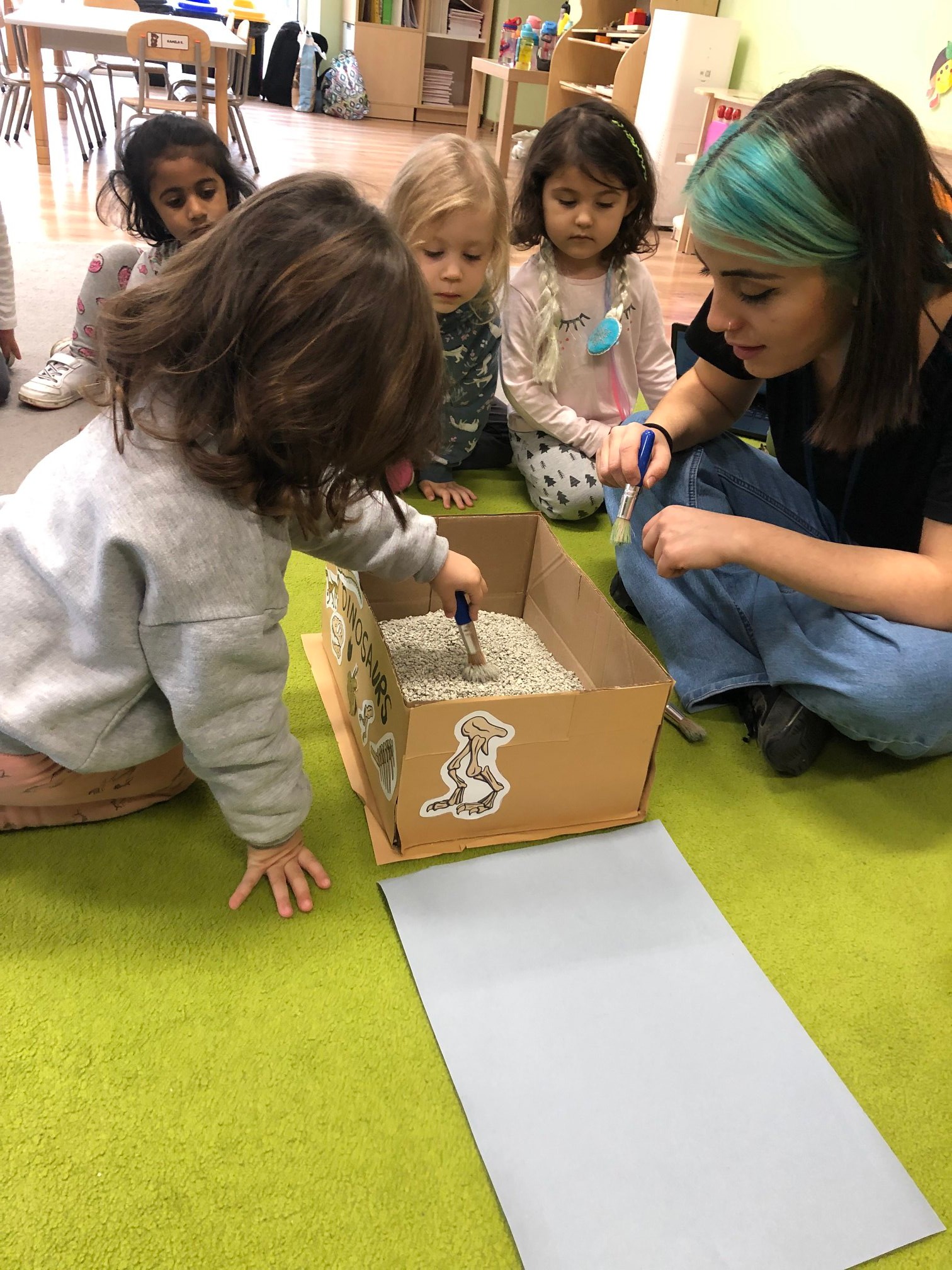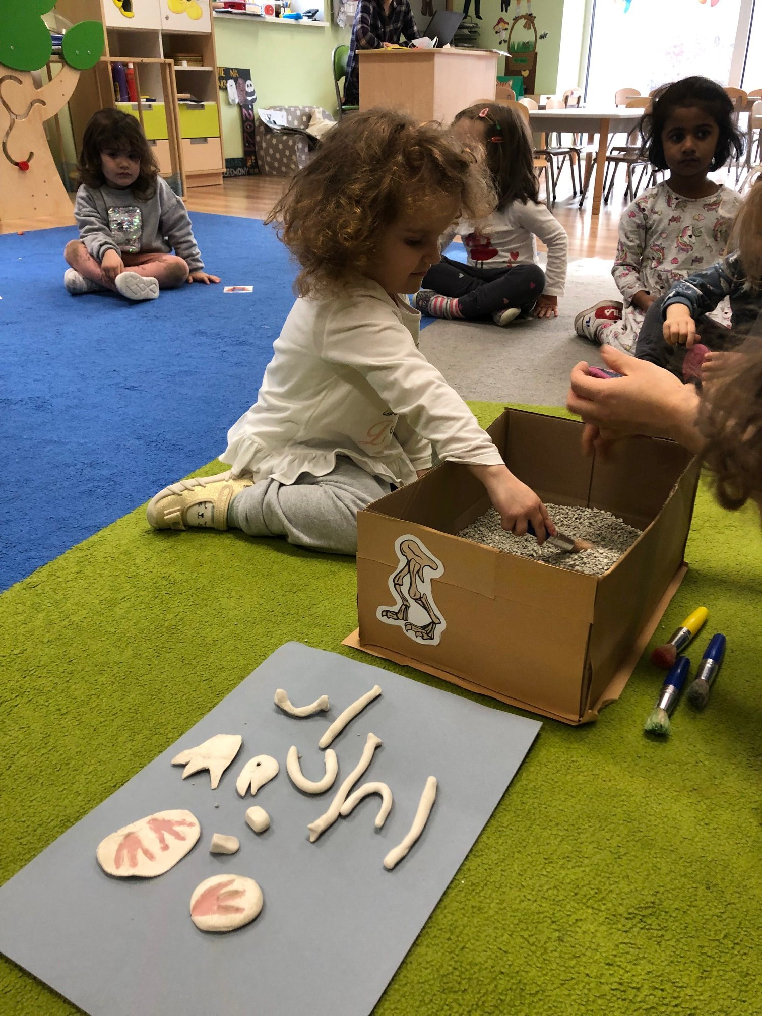 Bold Bears bawili się w Archeologów! Szukali kości i skamieniałości w pudełku z piaskiem, rozmawiali o kolorach dinozaurów, rozmiarach i czym się różniły. Jedne miały długie ogony, a inne krótkie, jedne pływały w wodzie i inne latały w powietrzu. Układali puzzle z dinozaurami, tworzyli dinozaury z papierowych talerzy, a także stworzyliśmy wspólnie dinozaura z tekturowych rolek!