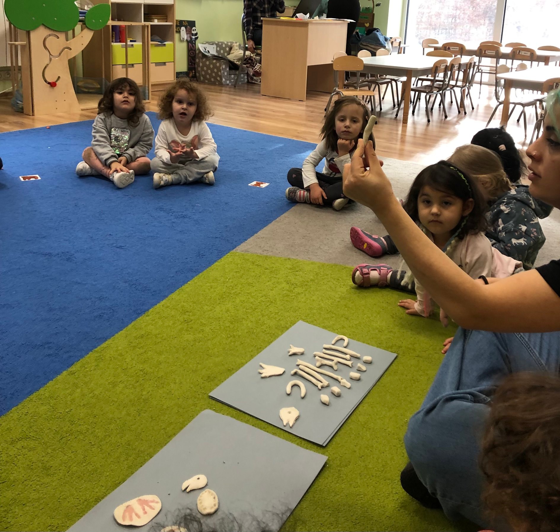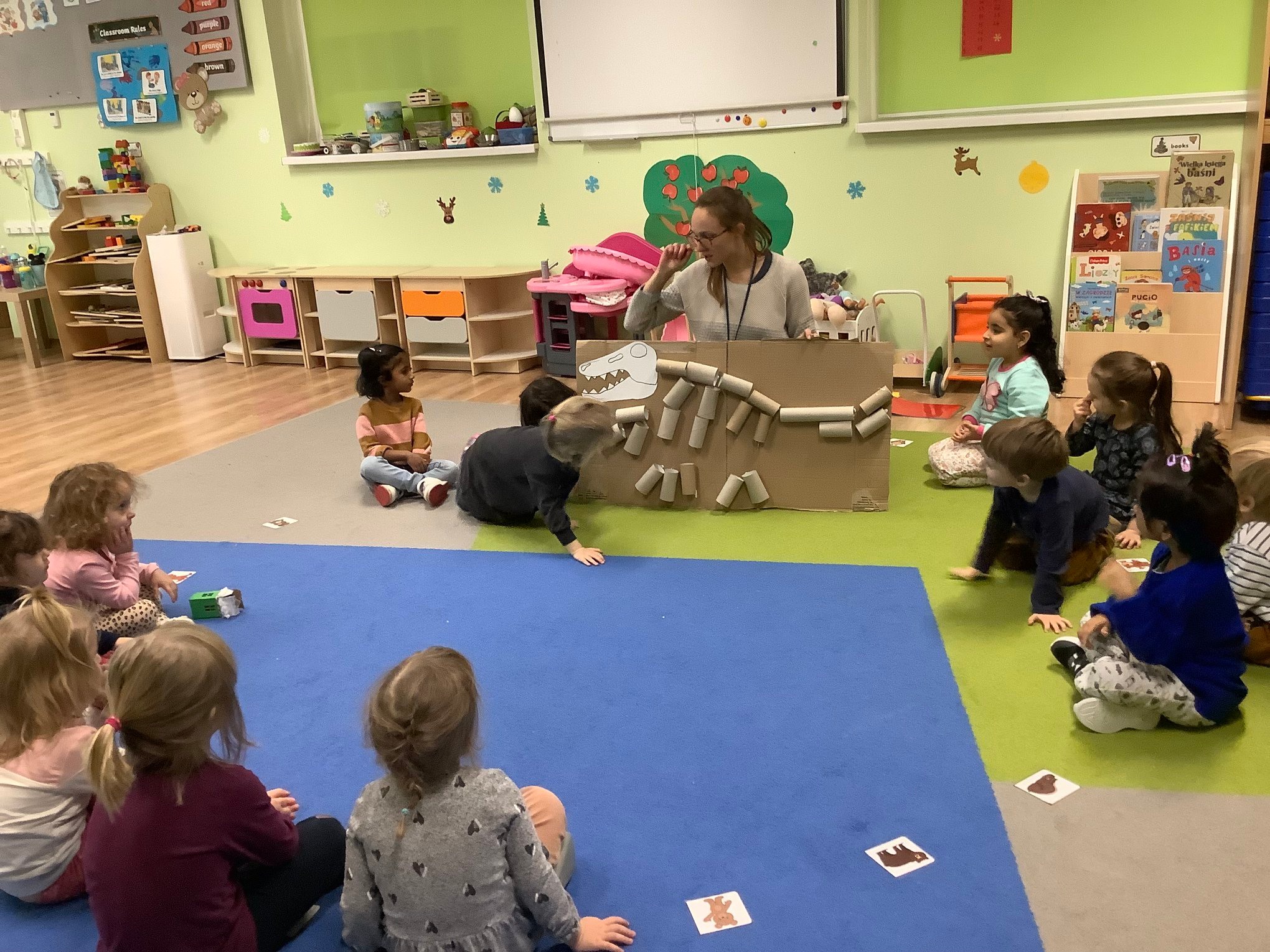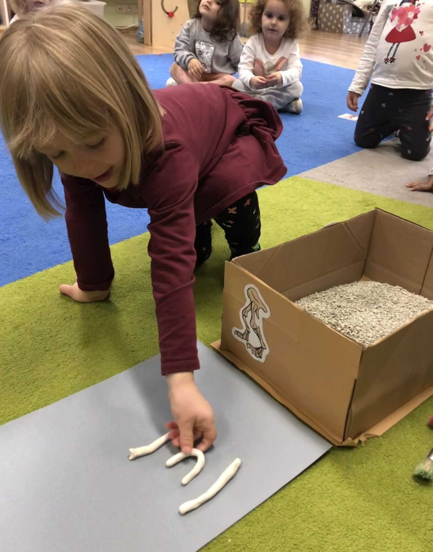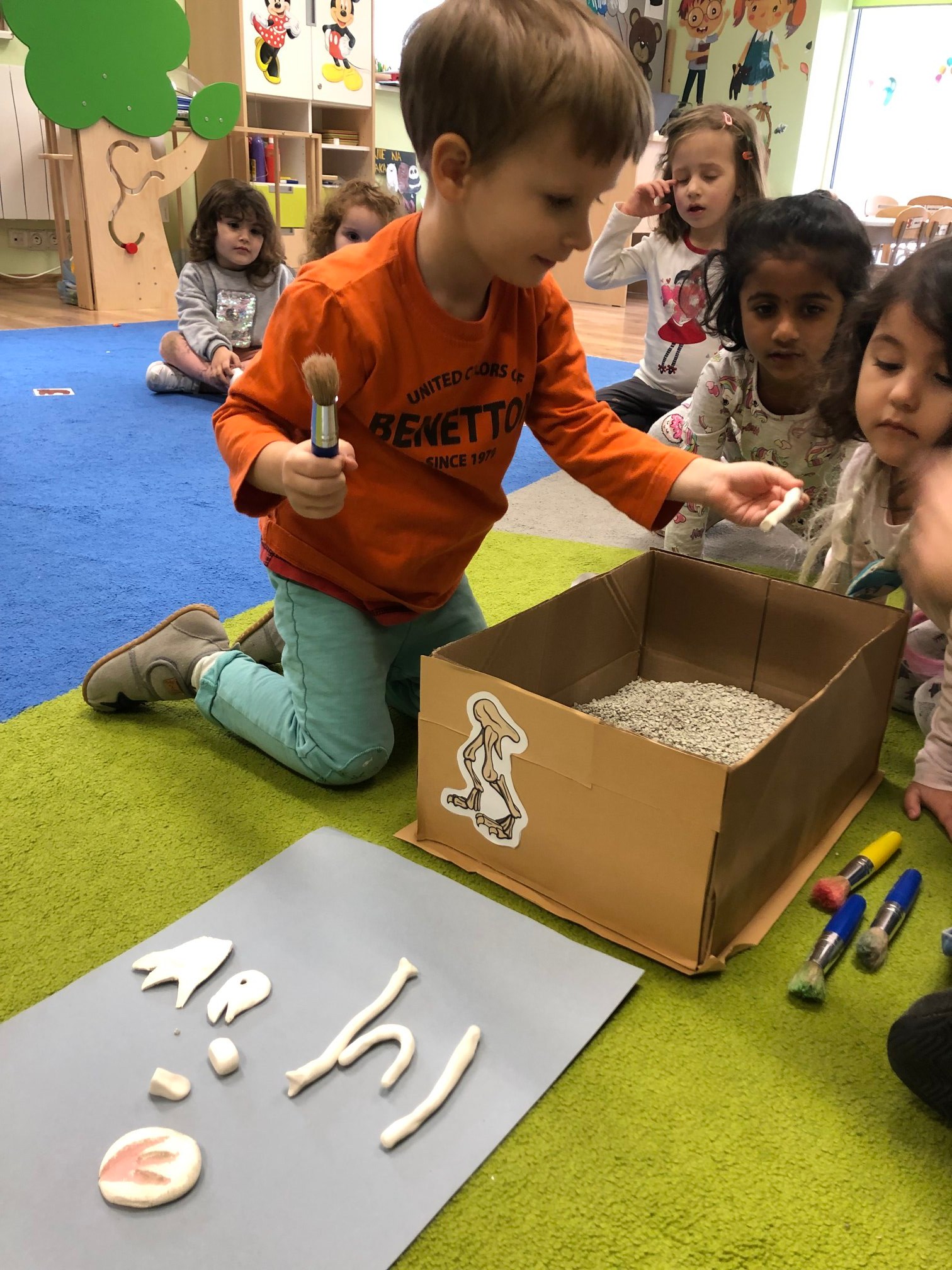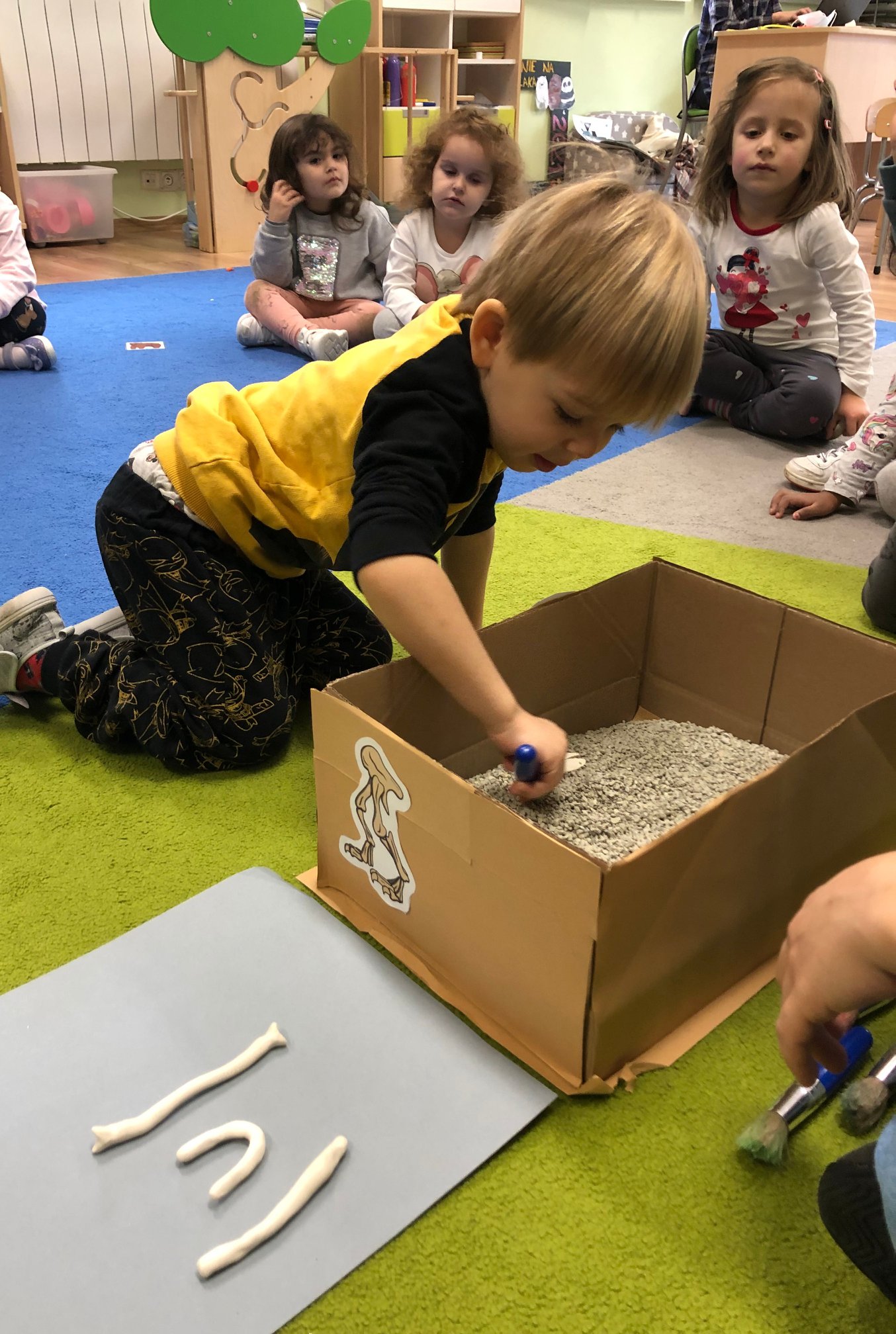 Bold Bears bawili się w Archeologów! Szukali kości i skamieniałości w pudełku z piaskiem, rozmawiali o kolorach dinozaurów, rozmiarach i czym się różniły. Jedne miały długie ogony, a inne krótkie, jedne pływały w wodzie i inne latały w powietrzu. Układali puzzle z dinozaurami, tworzyli dinozaury z papierowych talerzy, a także stworzyliśmy wspólnie dinozaura z tekturowych rolek!