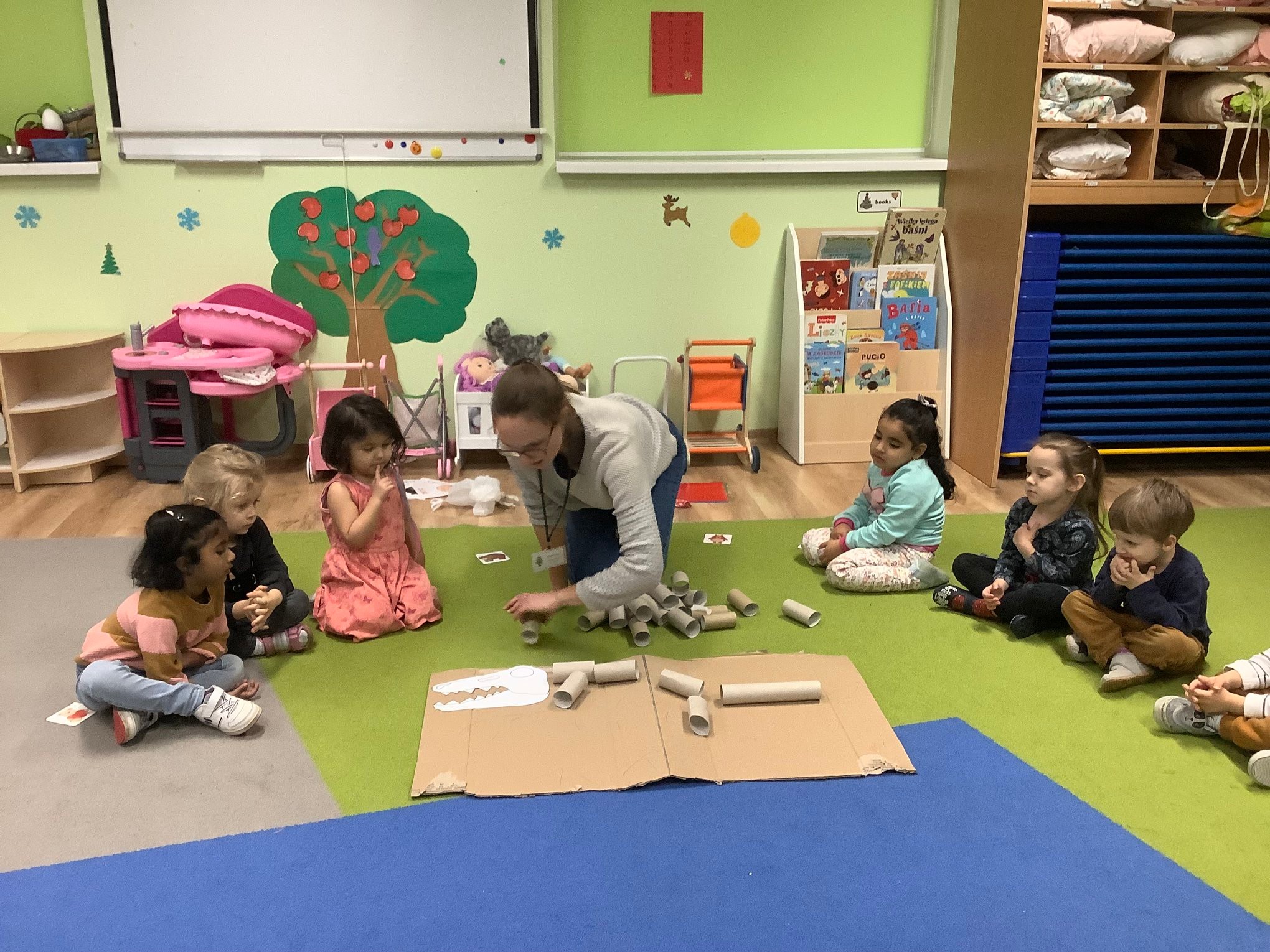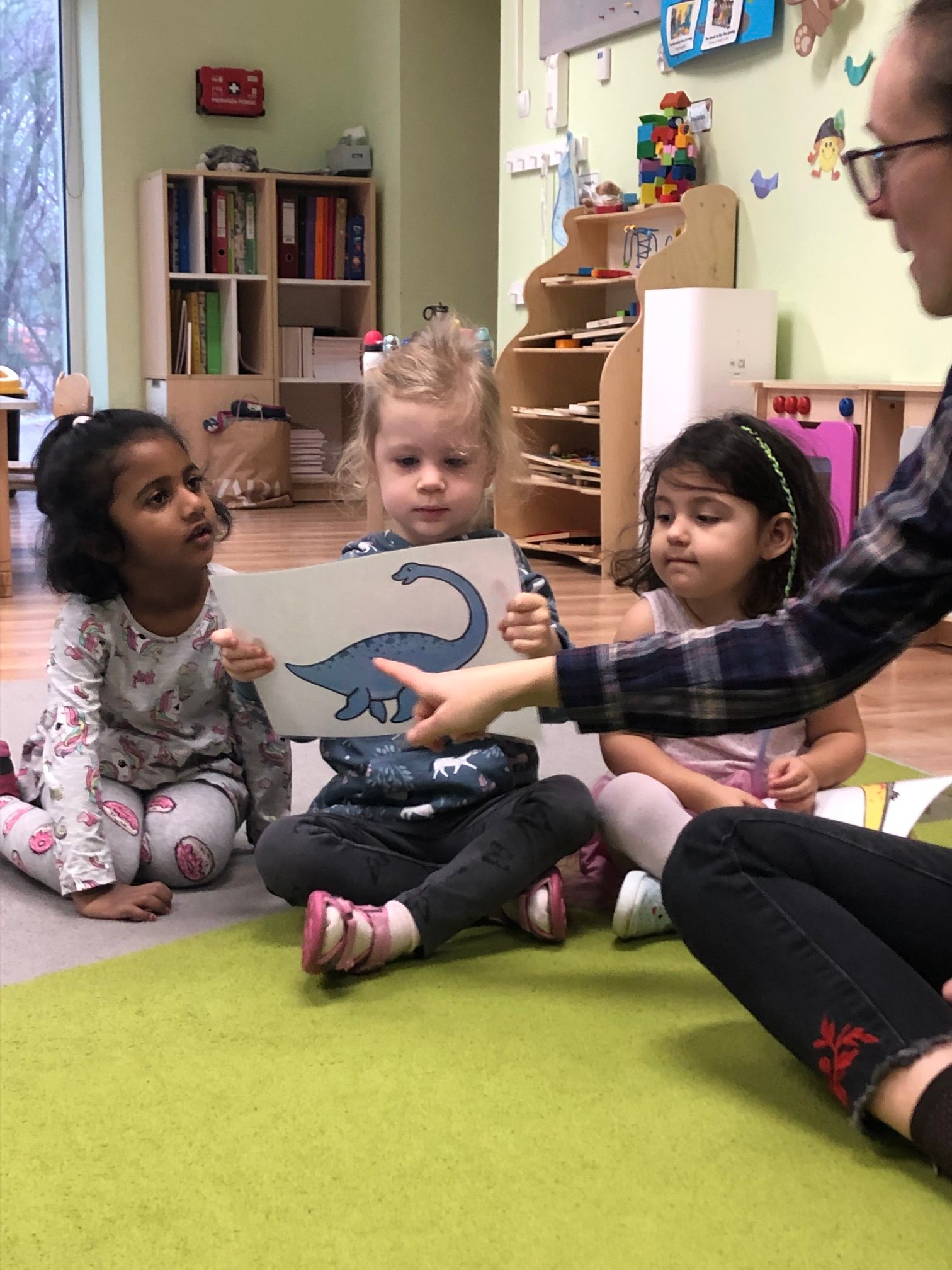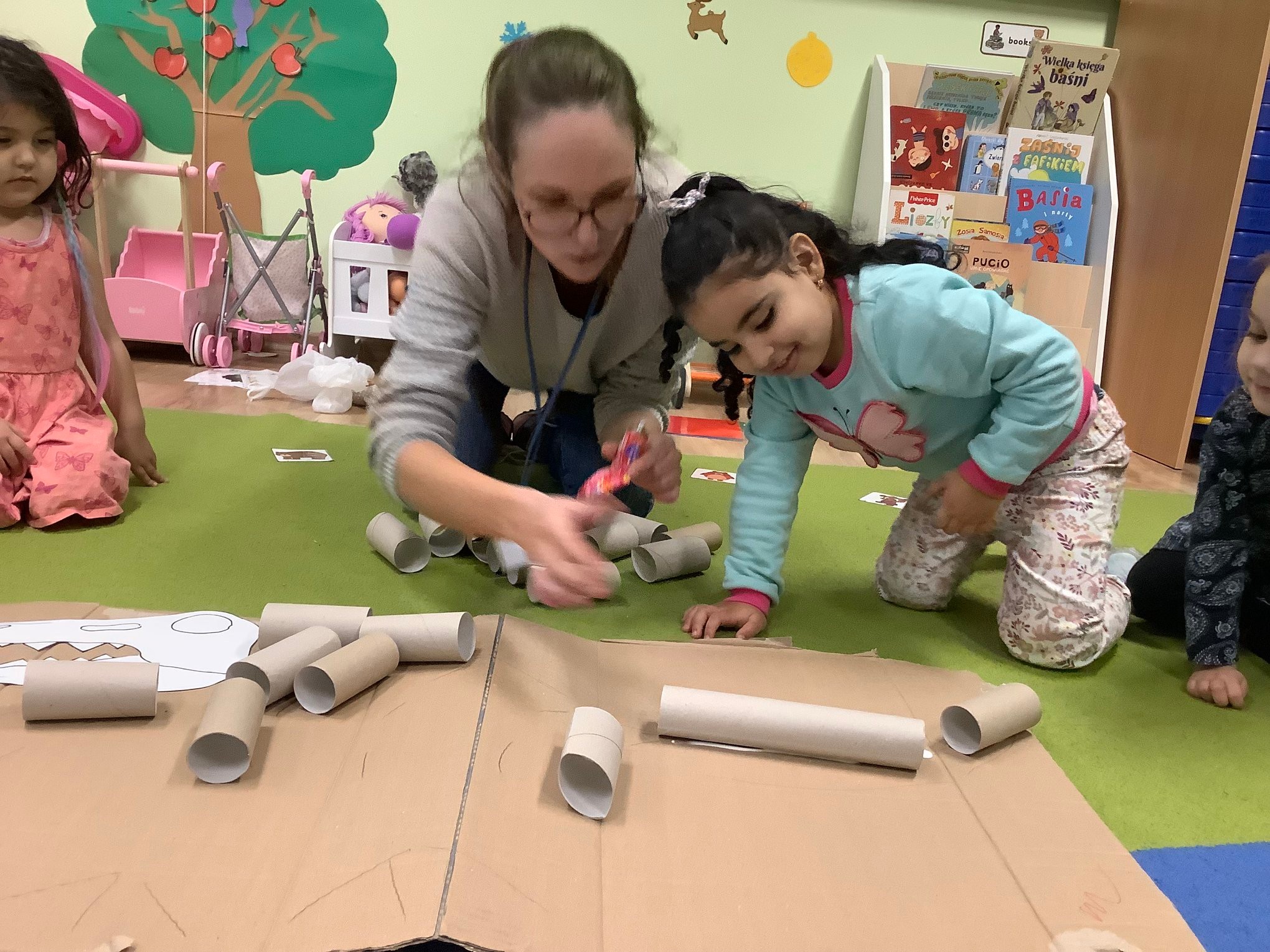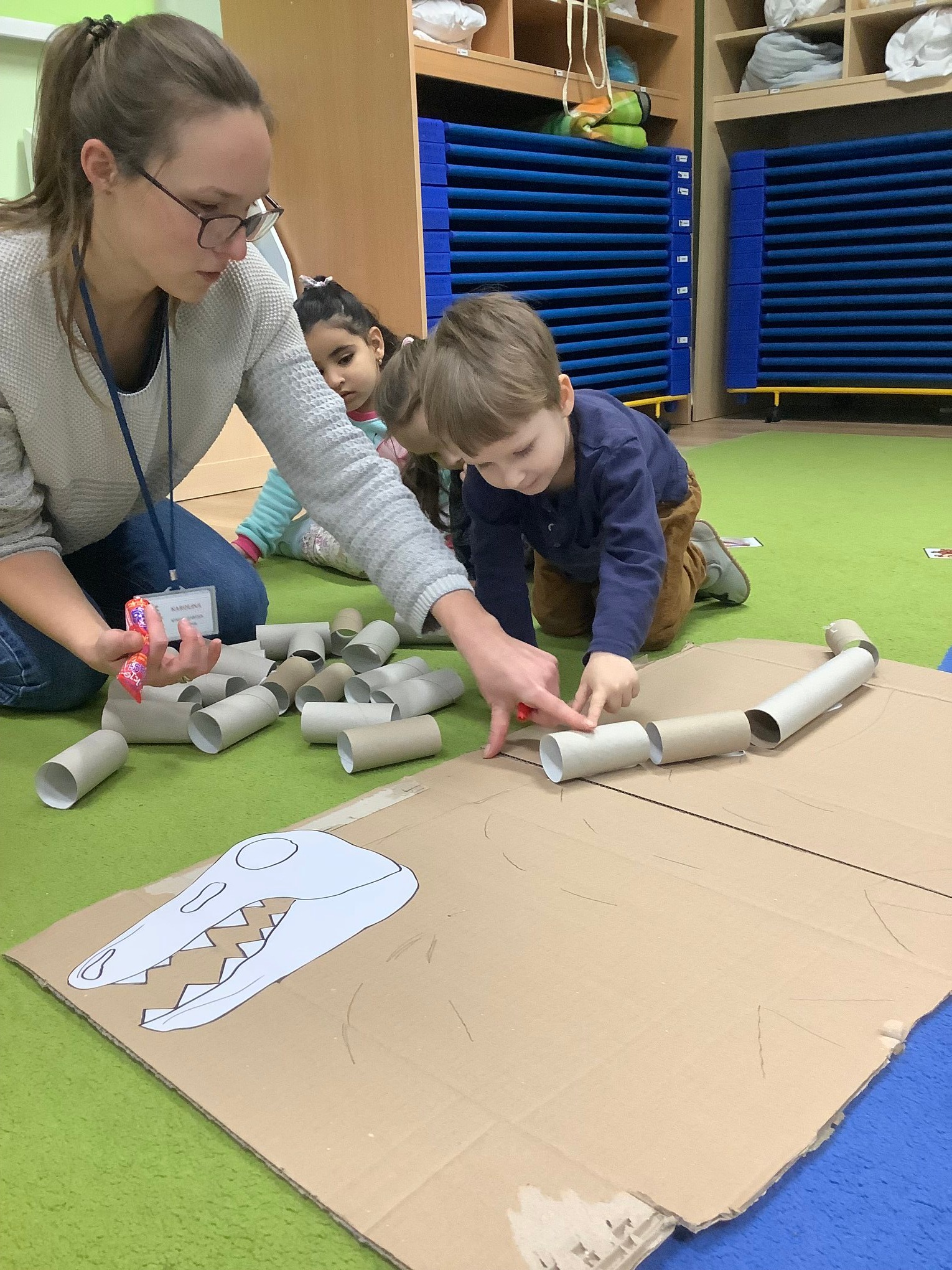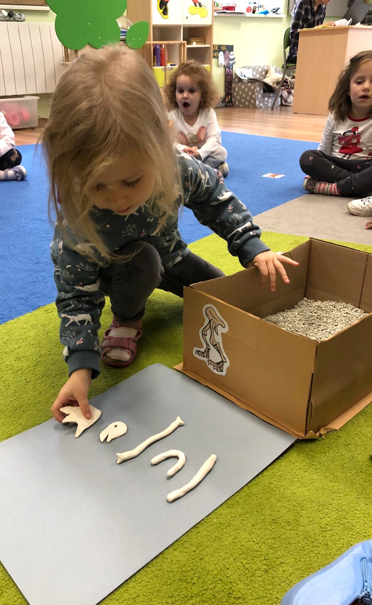 Bold Bears bawili się w Archeologów! Szukali kości i skamieniałości w pudełku z piaskiem, rozmawiali o kolorach dinozaurów, rozmiarach i czym się różniły. Jedne miały długie ogony, a inne krótkie, jedne pływały w wodzie i inne latały w powietrzu. Układali puzzle z dinozaurami, tworzyli dinozaury z papierowych talerzy, a także stworzyliśmy wspólnie dinozaura z tekturowych rolek!