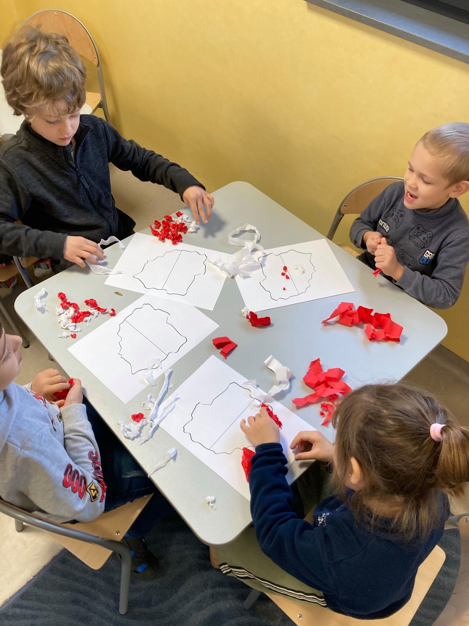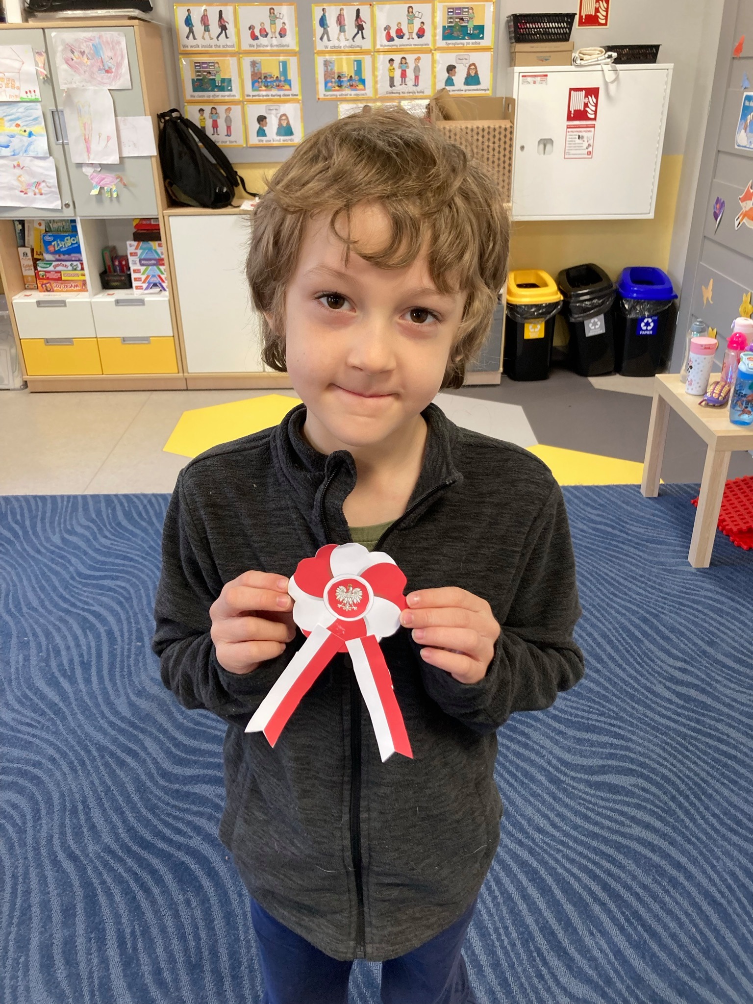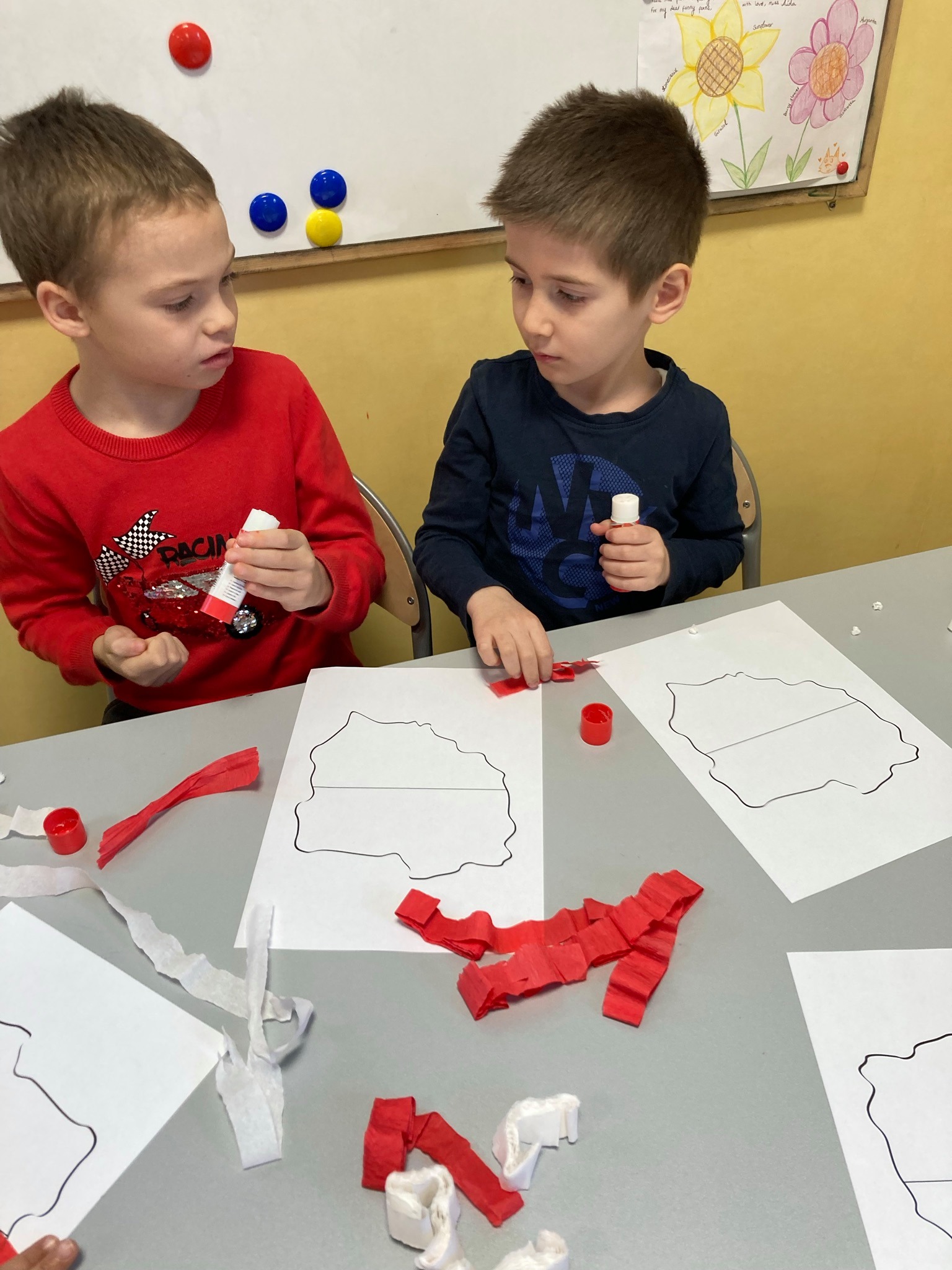 rozmawialiśmy o Święcie Niepodległości. Poznaliśmy polskie symbole narodowe, razem próbowaliśmy również zaśpiewać hymn Polski. Rozmawialiśmy również o tym, co symbolizują kolor biały i czerwony wykonując prace plastyczną w polskich barwach narodowych. Na koniec z dumą nosiliśmy samodzielnie wykonane kotyliony. ![]()